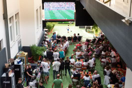 The high ropes course Jungfernheide offers a change of scenery, with a public viewing amidst trees and climbers. Their spacious round square is filled with various sitting options and is ideal for families with kids or large groups of friends. Several screens promise a great view no matter where you’re seated. The kitchen is also open during the games. Seats are limited, so reserve quickly.